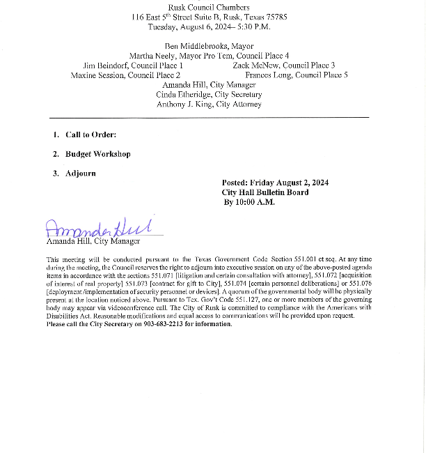 August 2, 2024| Budget, General Announcements, Public Notices, Resident Information, Town News| City of Rusk - CE
