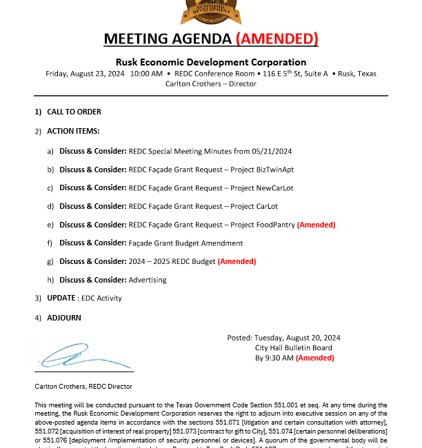August 20, 2024| General Announcements, Public Notices, Resident Information, Town News| City of Rusk - CE