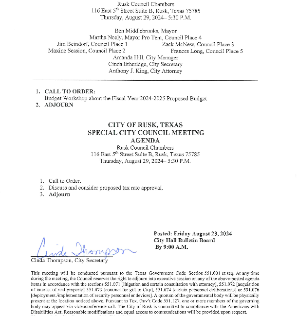 August 23, 2024| General Announcements, Public Notices, Resident Information, Town News| City of Rusk - CE