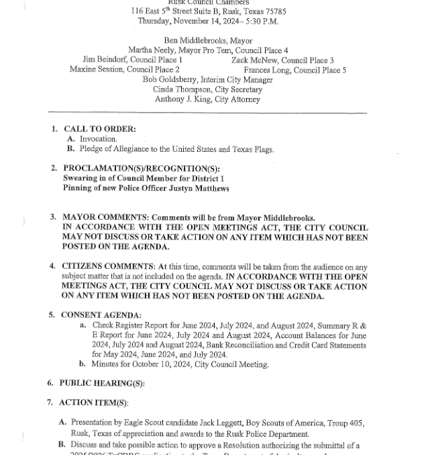 November 11, 2024| General Announcements, Public Notices, Resident Information, Town News| City of Rusk - CE