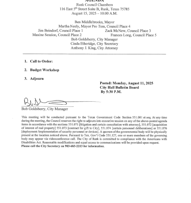 August 11, 2025| General Announcements, Public Notices, Resident Information, Town News| City of Rusk - CE