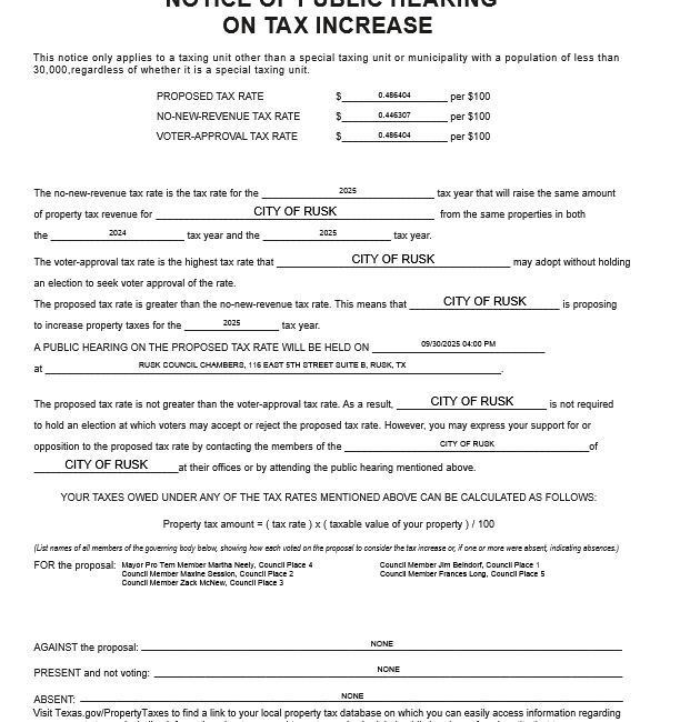 September 3, 2025| Budget, General Announcements, Public Notices, Resident Information, Town News| City of Rusk - CE