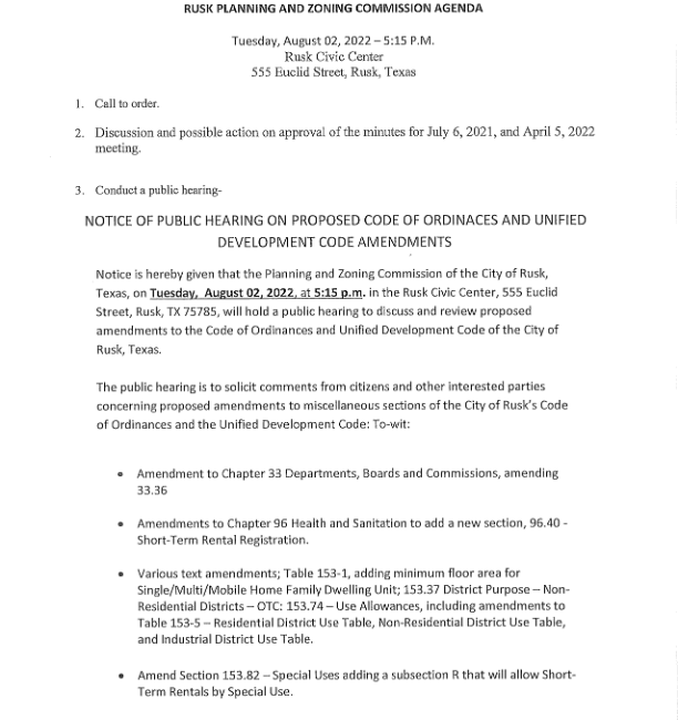 July 29, 2022| General Announcements, Public Notices, Resident Information, Town News| City of Rusk - CE