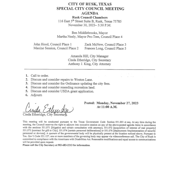November 30, 2023| General Announcements, Resident Information, Town News| City of Rusk - CE