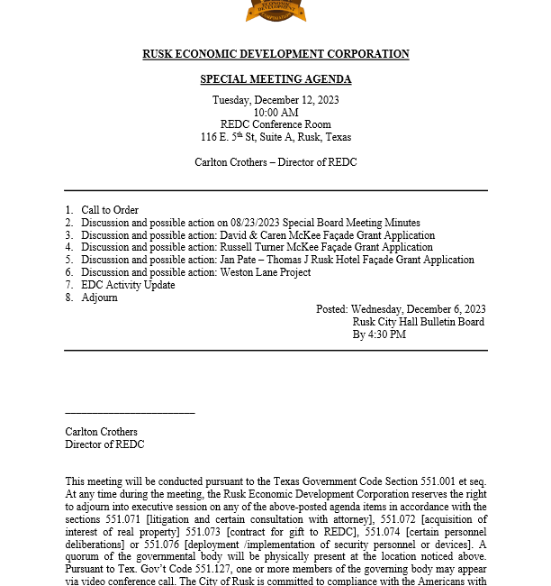 December 8, 2023| Public Notices, Resident Information, Town News| City of Rusk - CE