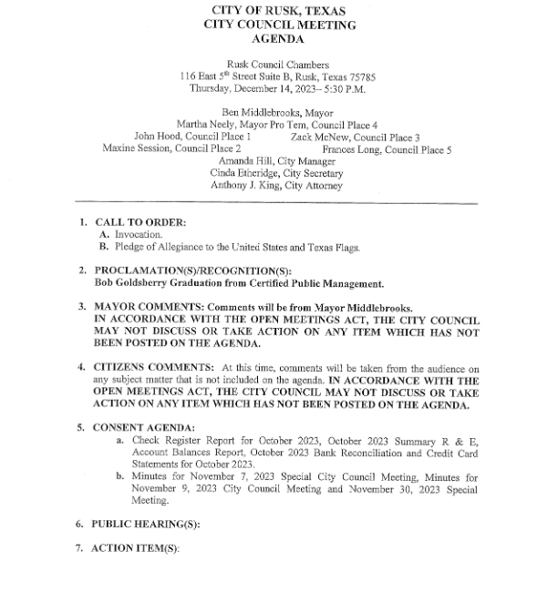 December 11, 2023| General Announcements, Resident Information, Town News| City of Rusk - CE