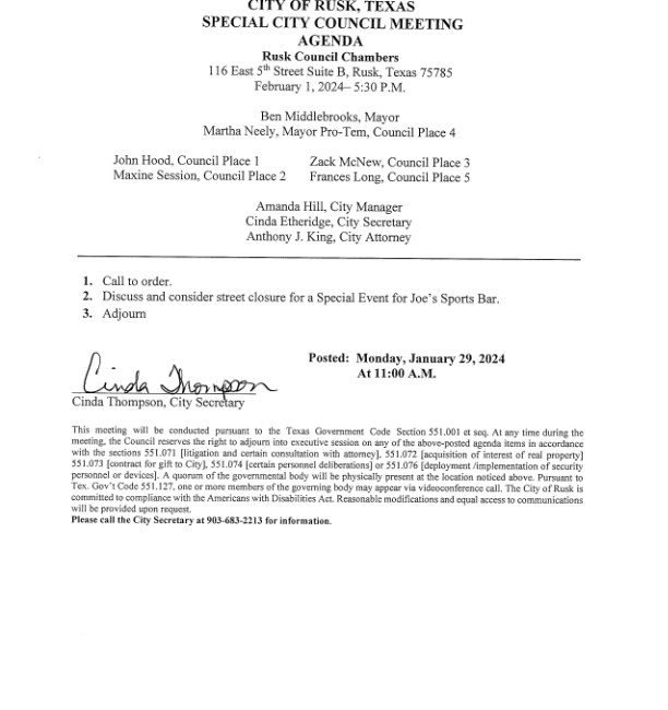 January 29, 2024| General Announcements, Public Notices, Resident Information, Town News| City of Rusk - CE
