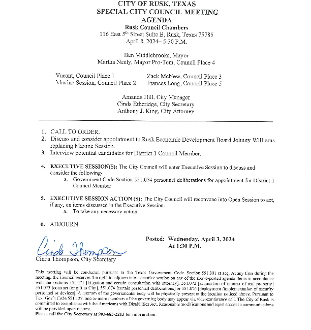 April 3, 2024| General Announcements, Public Notices, Resident Information, Town News| City of Rusk - CE