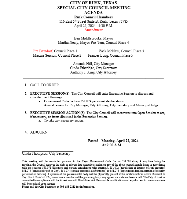 April 22, 2024| General Announcements, Public Notices, Resident Information, Town News| City of Rusk - CE
