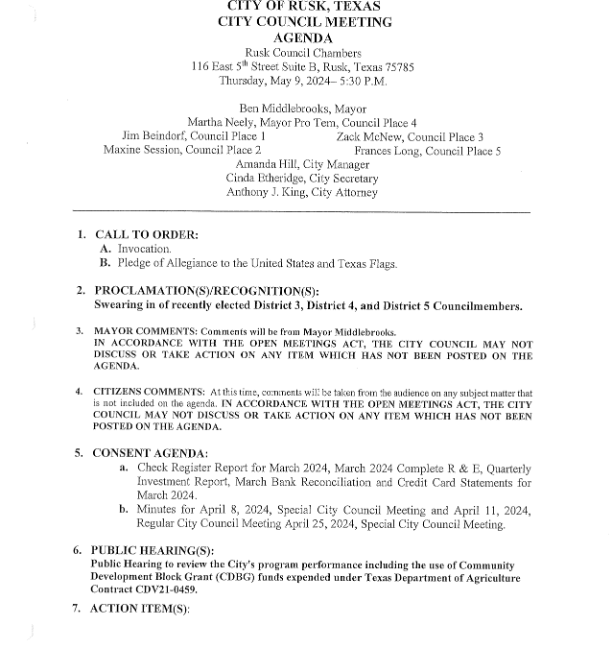 May 9, 2024| General Announcements, Public Notices, Resident Information, Town News| City of Rusk - CE