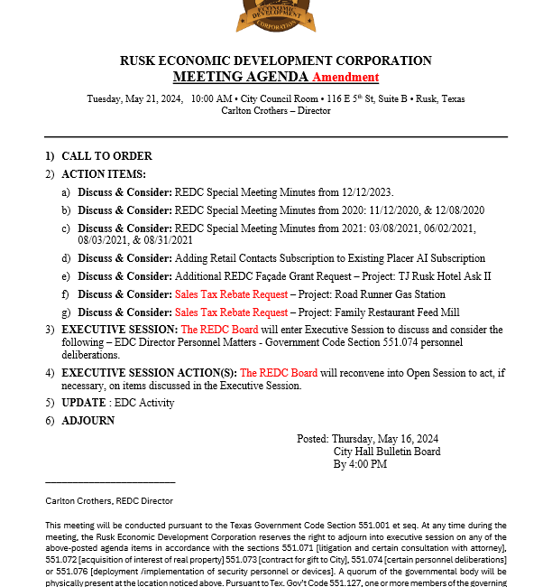 May 14, 2024| General Announcements, Resident Information, Town News| City of Rusk - CE