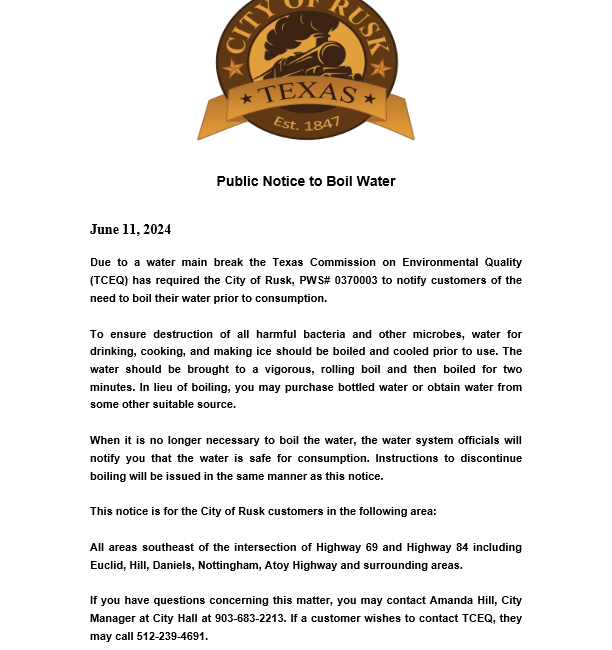 June 11, 2024| Public Notices, Resident Information, Town News| City of Rusk - CE