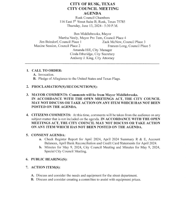June 12, 2024| General Announcements, Public Notices, Resident Information, Town News| City of Rusk - CE